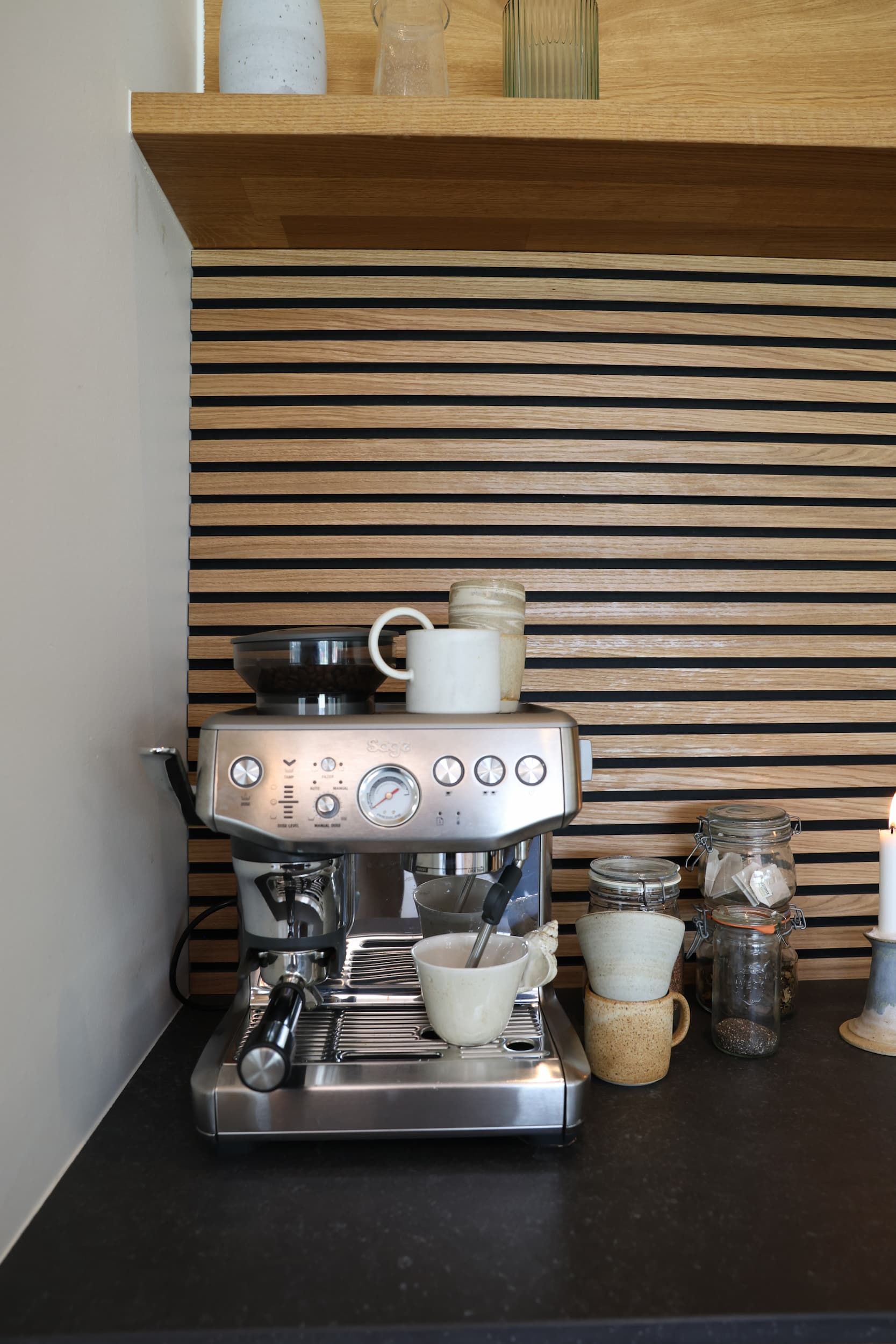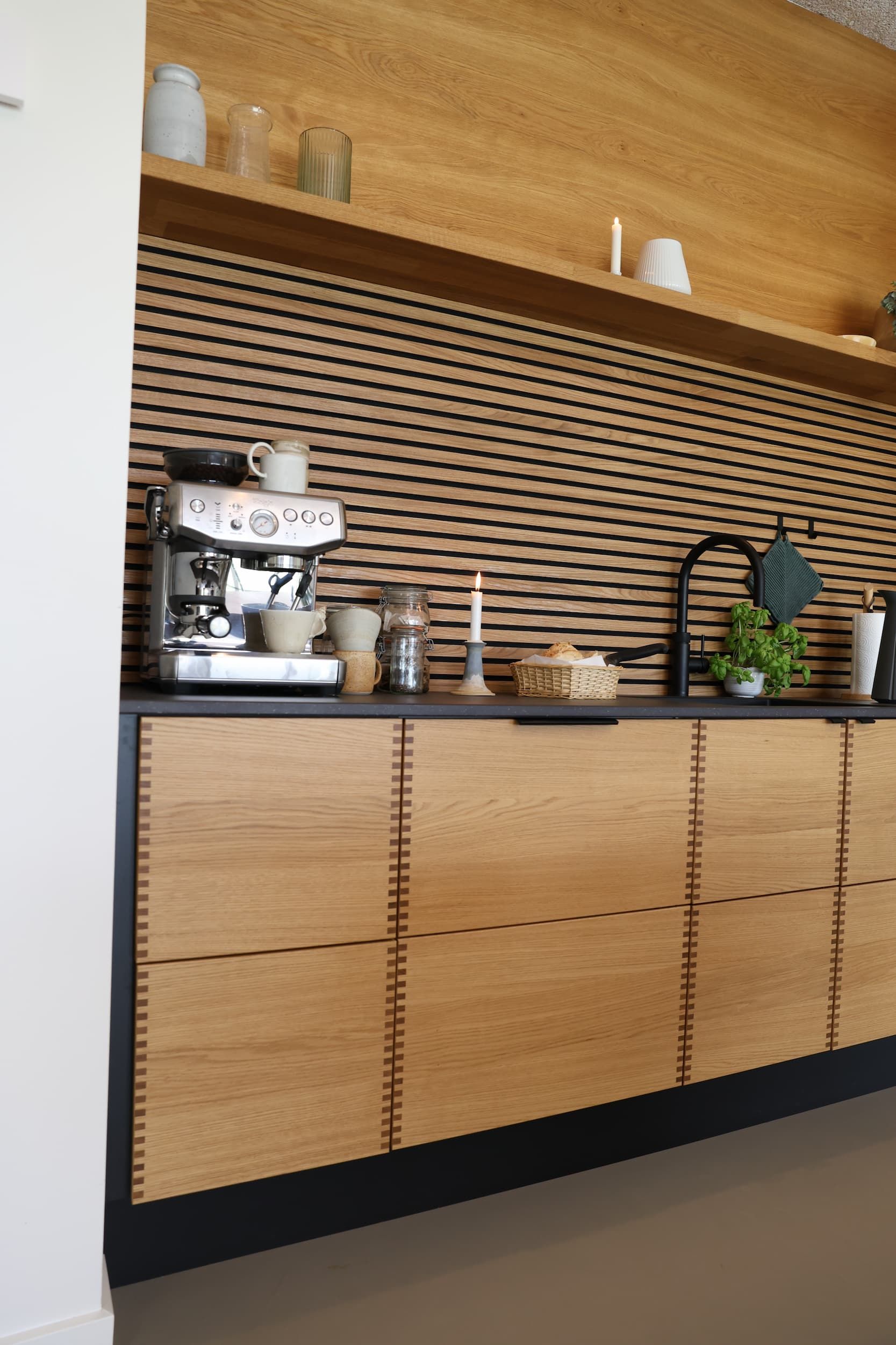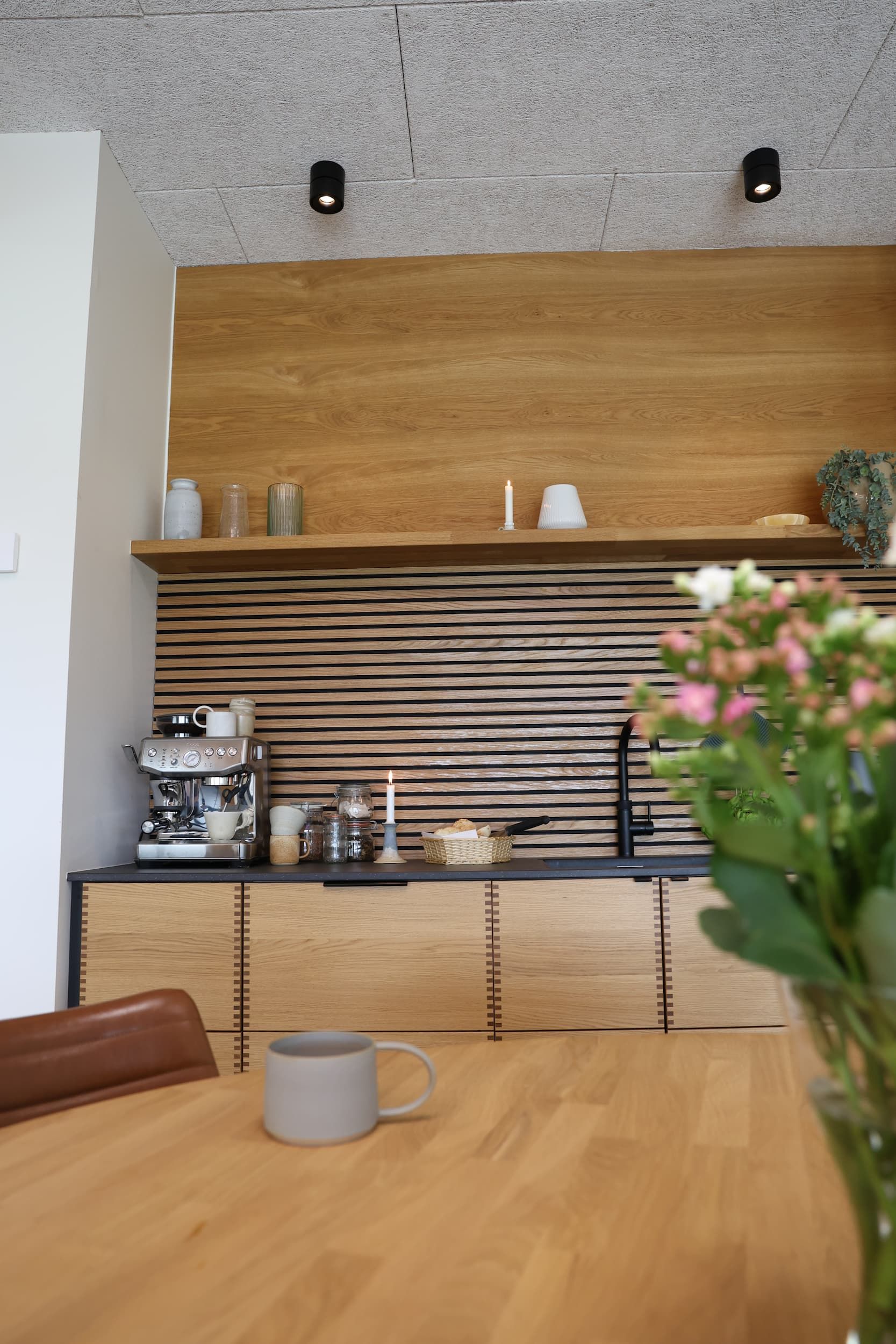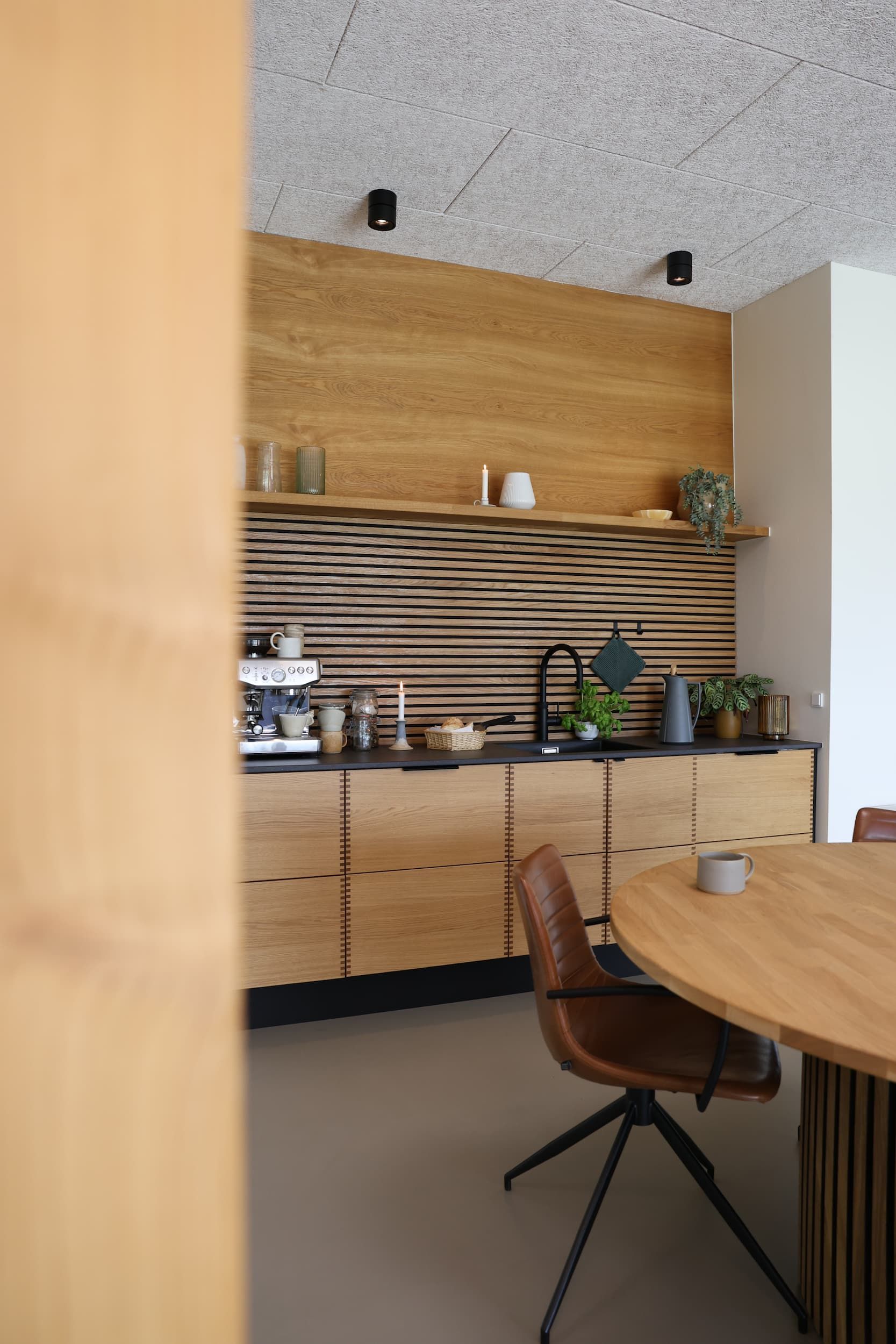 Transform your kitchen with our oak panels, treated with our own natural oil and beautifully installed here to enhance both style and functionality. Much more than just a visual upgrade, these Danish-made panels significantly improve the room’s acoustics. The combination of natural wood slats and acoustic felt absorbs sound waves, creating a calmer, more enjoyable space. Made with materials from responsibly managed sources, our panels bring both elegance and acoustic comfort to any setting—whether for private homes, commercial spaces, or public buildings.