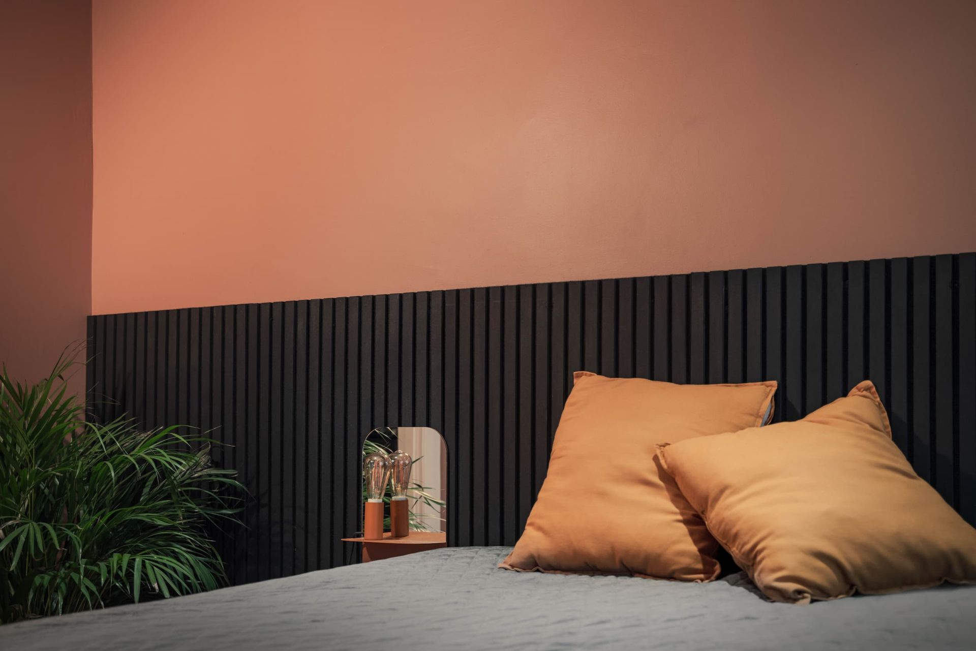 Transform your bedroom with our linoleum panel in the color Powder, used here as a stunning headboard. Known for its natural, matte surface, linoleum feels warm and pleasant to the touch, adding a modern and exclusive touch to your interior. It also enhances the room’s acoustics, reducing noise for a more peaceful atmosphere. With 20 different colors to choose from, there’s something to suit every style and taste. Choose linoleum if you want a stylish and durable alternative to traditional materials.